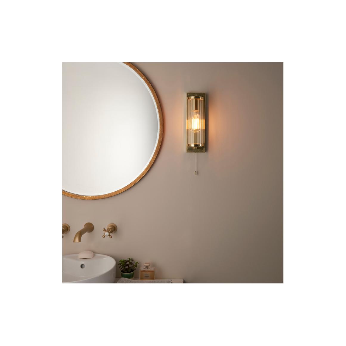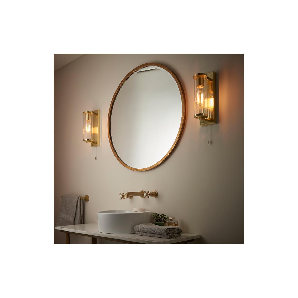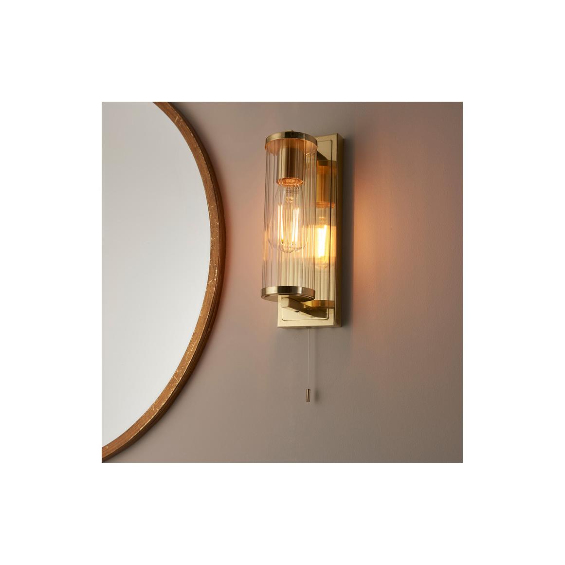 - Satin brass effect metalwork with clear ribbed glass diffuser