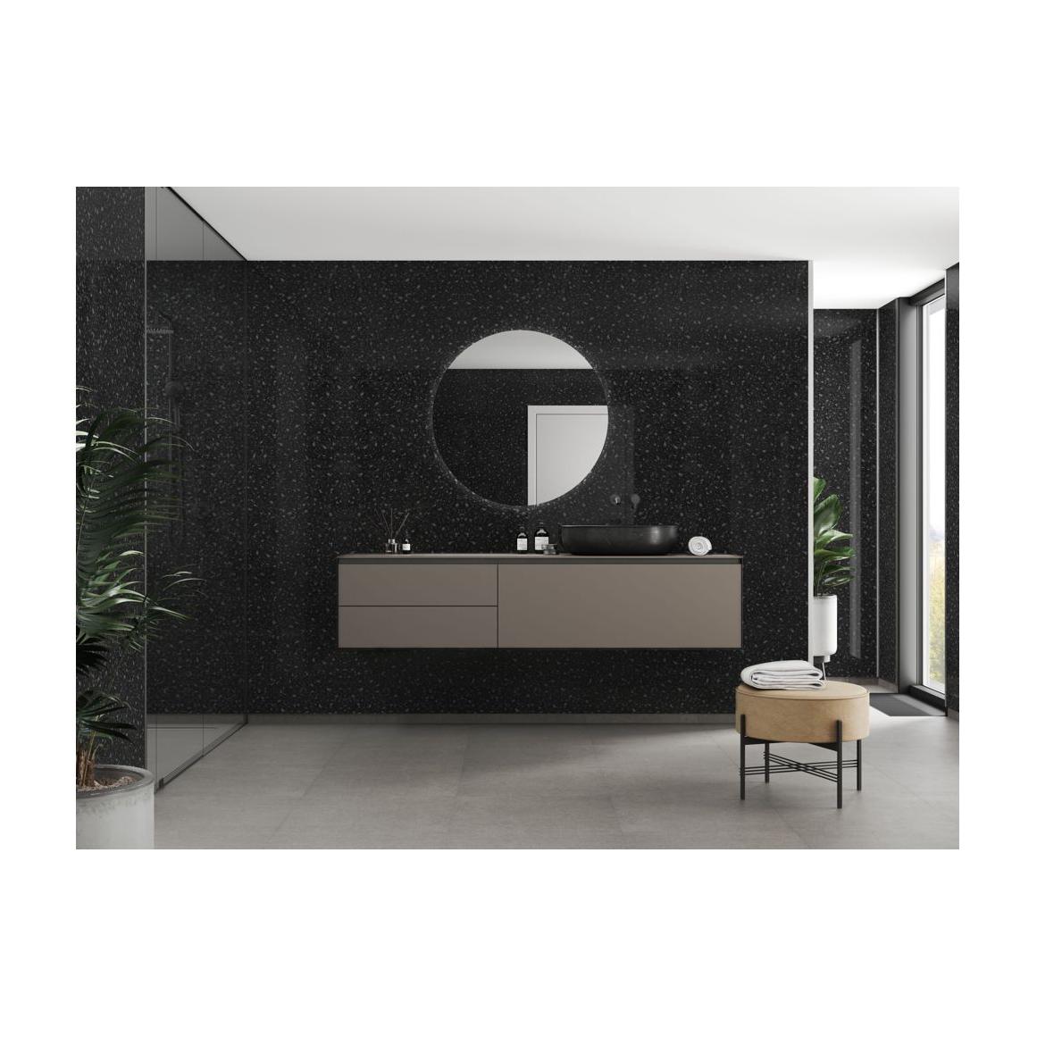 - This decor has a deep black marble design to it. With it’s glossy finish and classic grey flecks it is both decorative and stylish.