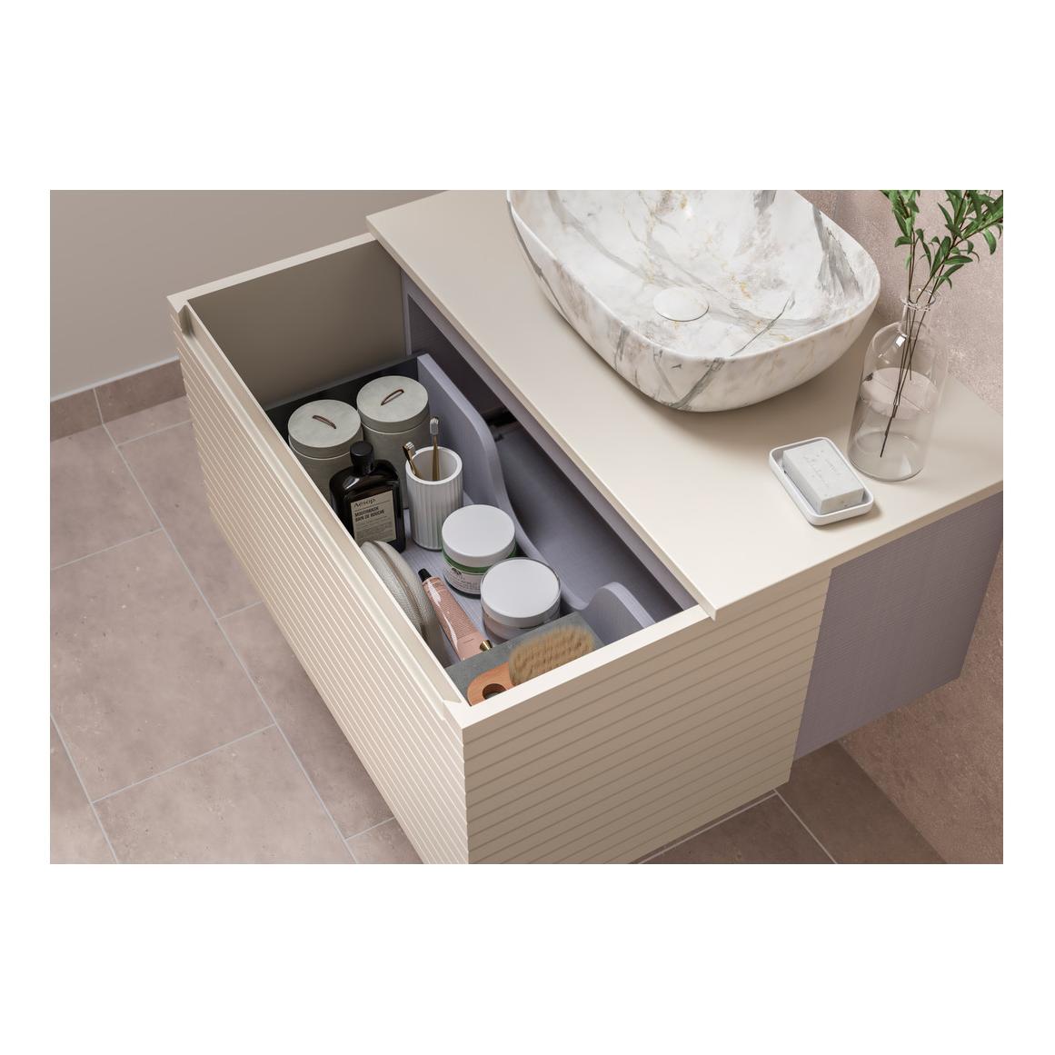 - Textured handleless furniture with soft horizontal fluted lines and a wrap around drawer box